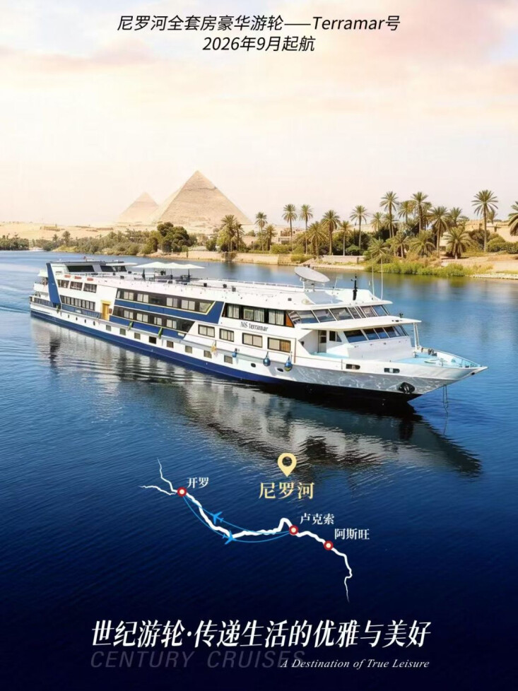 世纪游轮独家包租的高端游轮 “特拉玛号”,将于2026年9月4日首航埃及尼罗河,将古埃及的神秘、黄金时代的优雅与新世纪的舒适融为一体,续写永恒之河上的现代篇章。