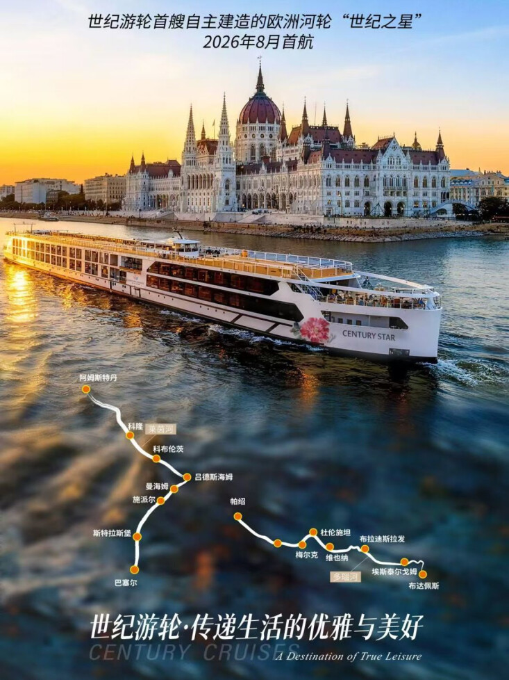 旗下专为欧洲水域打造的 “世纪之星号” 将于 2026年8月28日首航,执航欧洲两大经典河流——多瑙河与莱茵河,并推出一期一会的“双河航次”以及可遇不可求的“三河航线”。