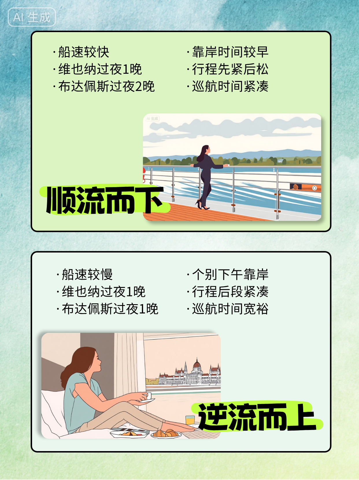 🔻下水:航行时间相对短,好处是夜晚航行,白天靠岸时间早,有更多时间游玩