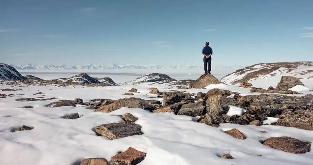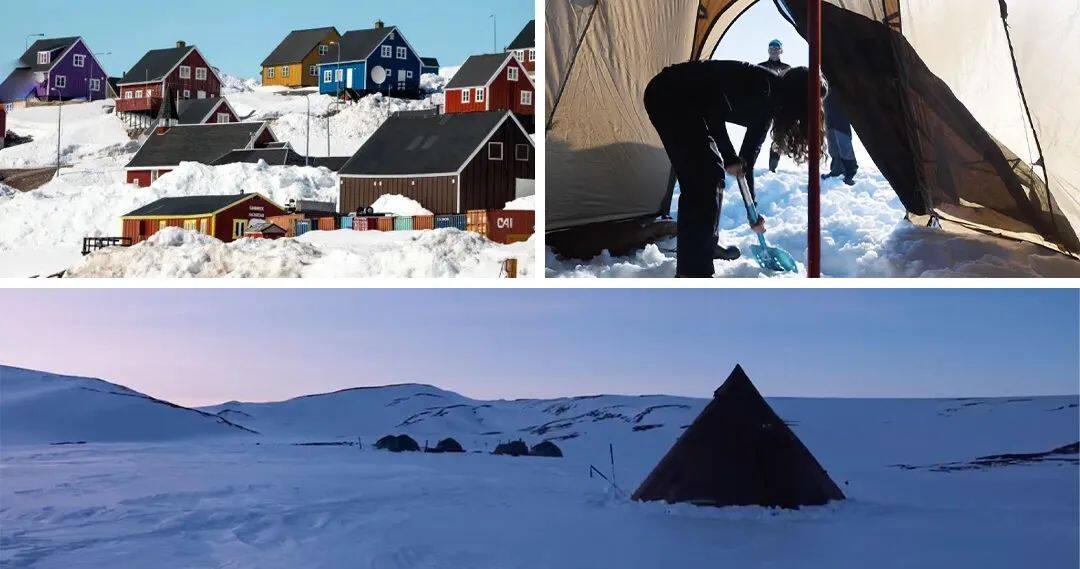 团队沿着因纽特猎人的足迹向山区继续进发。周围是高山景观与“震耳欲聋的寂静”,只有山谷中偶尔传来的雪橇犬吠声打破这一切。队伍经过一片白雪覆盖的冰冻湖边,湖边点缀着几间渔民的小屋。