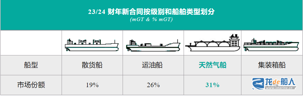 值得一提的是,在2023/24 财年中,LR在所有主要船舶细分市场中的新造船表现也依旧亮眼, 在四大主要船型领域市场表现突出。特别是在气体船领域,市场份额位居全球第一,拿下全球 31%的市场份额。