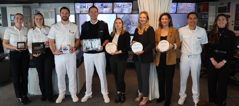为庆祝首次访问,举行了传统的牌匾交换仪式,船长 Jens Troier 以及勒阿弗尔市、勒阿弗尔十字路口、海员俱乐部和旅行社的有关当局出席了此次仪式。