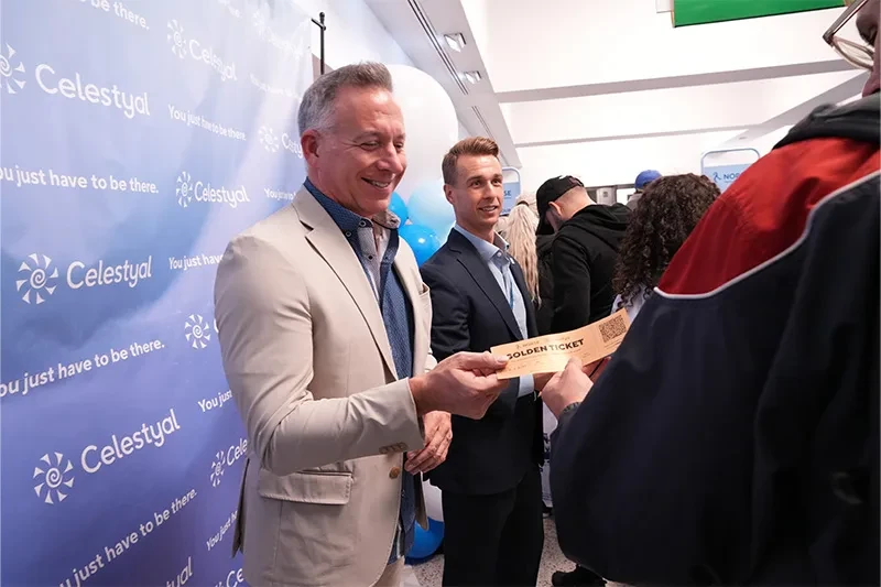 Celestyal 的副总裁兼北美销售和业务开发董事总经理 John Diorio 以及 Norse 的北美销售主管 Tyler Pierce 主持了此次活动并帮助分发门票。