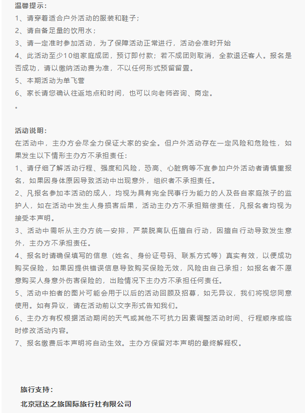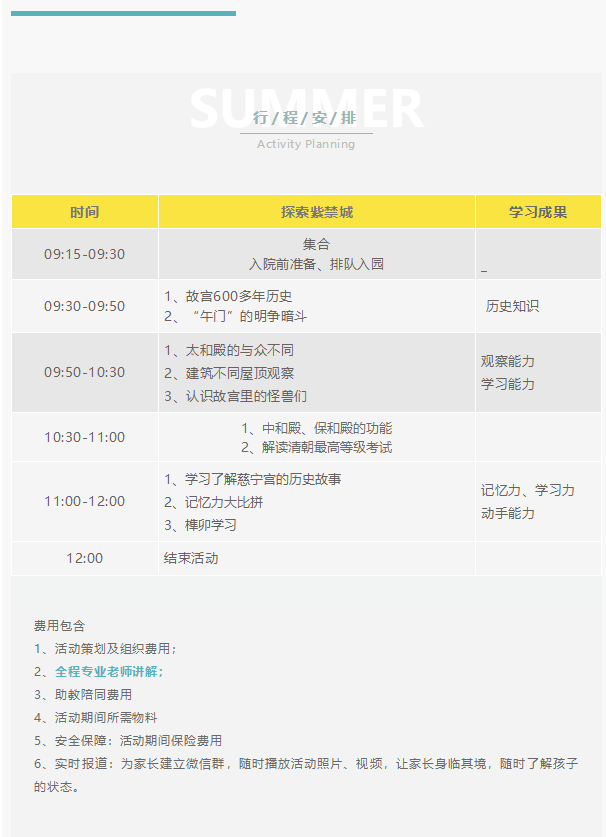 1.活动执行:1:5的师生比(每5名儿童配备1名老师); 2.安全保障:为营员购买保险; 3.实时报道:为家长建立微信群,随时播放活动照片、视频,随时记录孩子的状态。