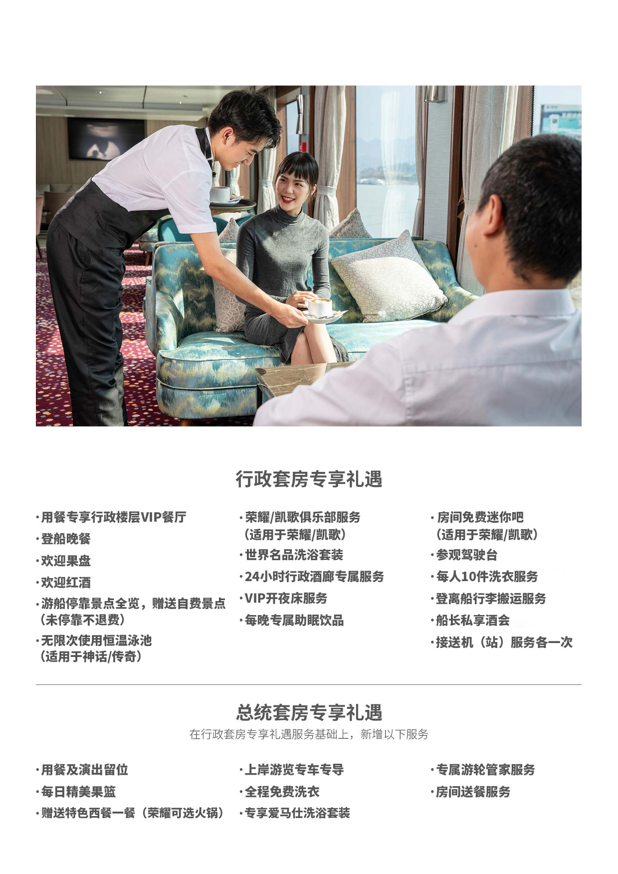 住宿:世纪荣耀或世纪凯个游轮--行政套房或总统套 景点: 含行程所列大门票 用餐: 全程游船上用餐(含首晚游轮桌餐) 用车:行程中下船游览期间乘坐的旅游用车费用 导游:行程中下船游览期间的导游费用 行政套房礼遇: 1) 专享行政楼层VIP餐厅; 2) 游船停靠景点全揽;赠送自费景点(未停靠不退费) 3) 24小时行政酒廊专属服务; 4) 无限次使用恒温泳池(适用于神话/传奇); 5) 船长私享酒会; 6) 登船晚餐; 7) 欢迎果盘; 8) 欢迎红酒; 9) VIP开夜床服务; 10) 专属助眠饮品; 11) 世界名品洗浴套组; 12) 参观驾驶台; 13) 每人10件洗衣服务; 14) 登离船行李搬提服务; 15) 接送机(站)服务各一次。 总统套房在行政套基础上增加礼遇: 16) 专属游轮管家服务; 17) 岸上观光专车专导; 18) 用餐及演出留位; 19) 每日精美果篮; 20) 全程免费洗衣; 21) 专享爱马仕洗浴套组; 22) 房间送餐服务; 23) 特色西餐一餐。 备注:行政套房及总统套房礼遇为船票打包赠送产品,如不需要及不参加游览费用不退,旅行社不承担任何责任!